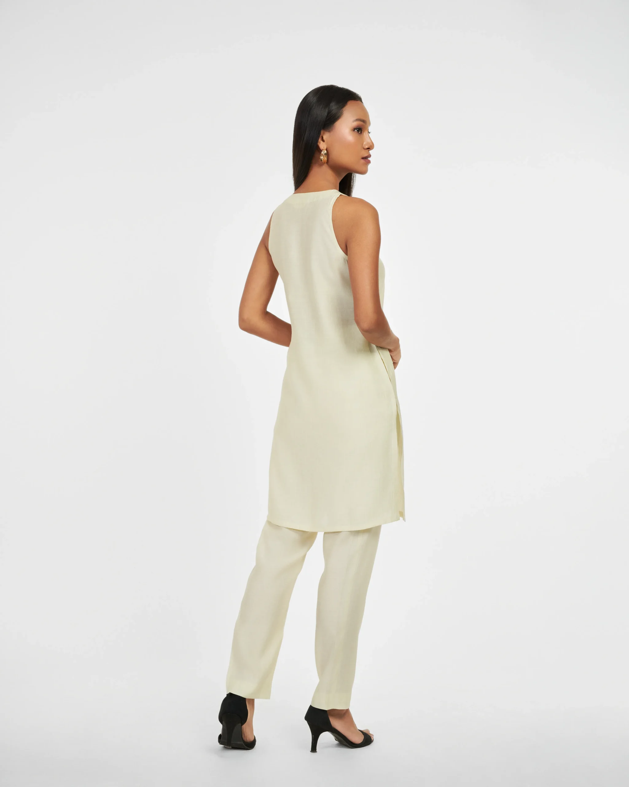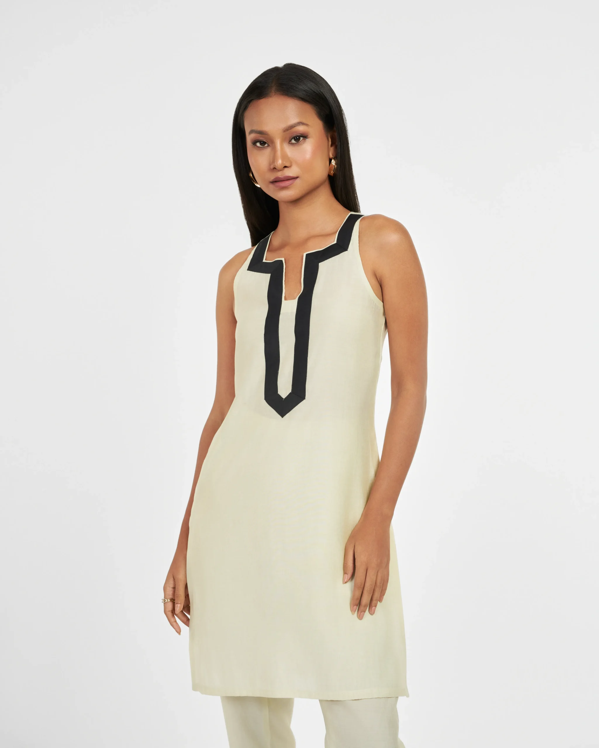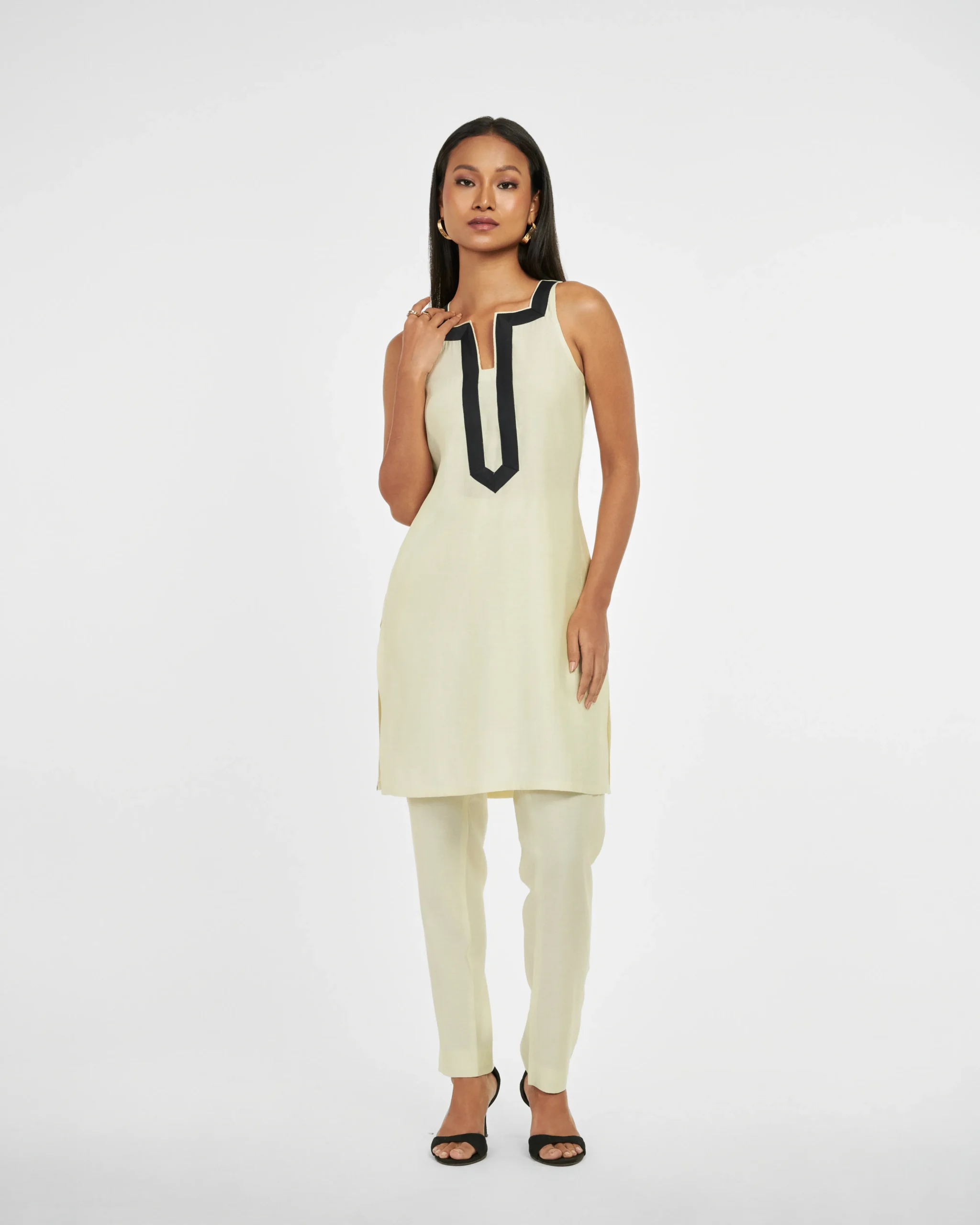 Pista Panache is a timeless contemporary blend of neutral pista green short kurta set. Adequate sheer fabric provides luxurious feel and look. Exquisite neutral pista green hue exudes elegance and Black lining on the neck adds refined contrast. The trousers have side pocket and side zipper for enhanced comfort. A perfect comfortable, breathable design for all-day wear.