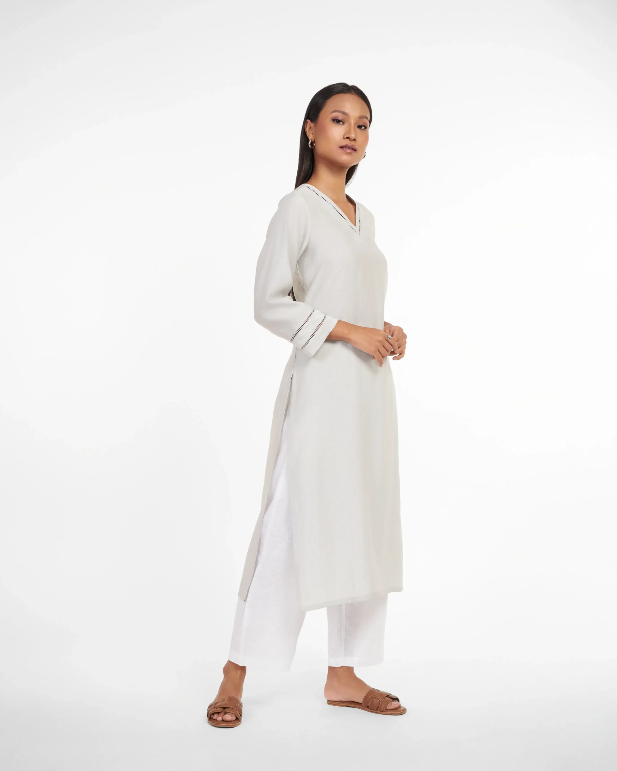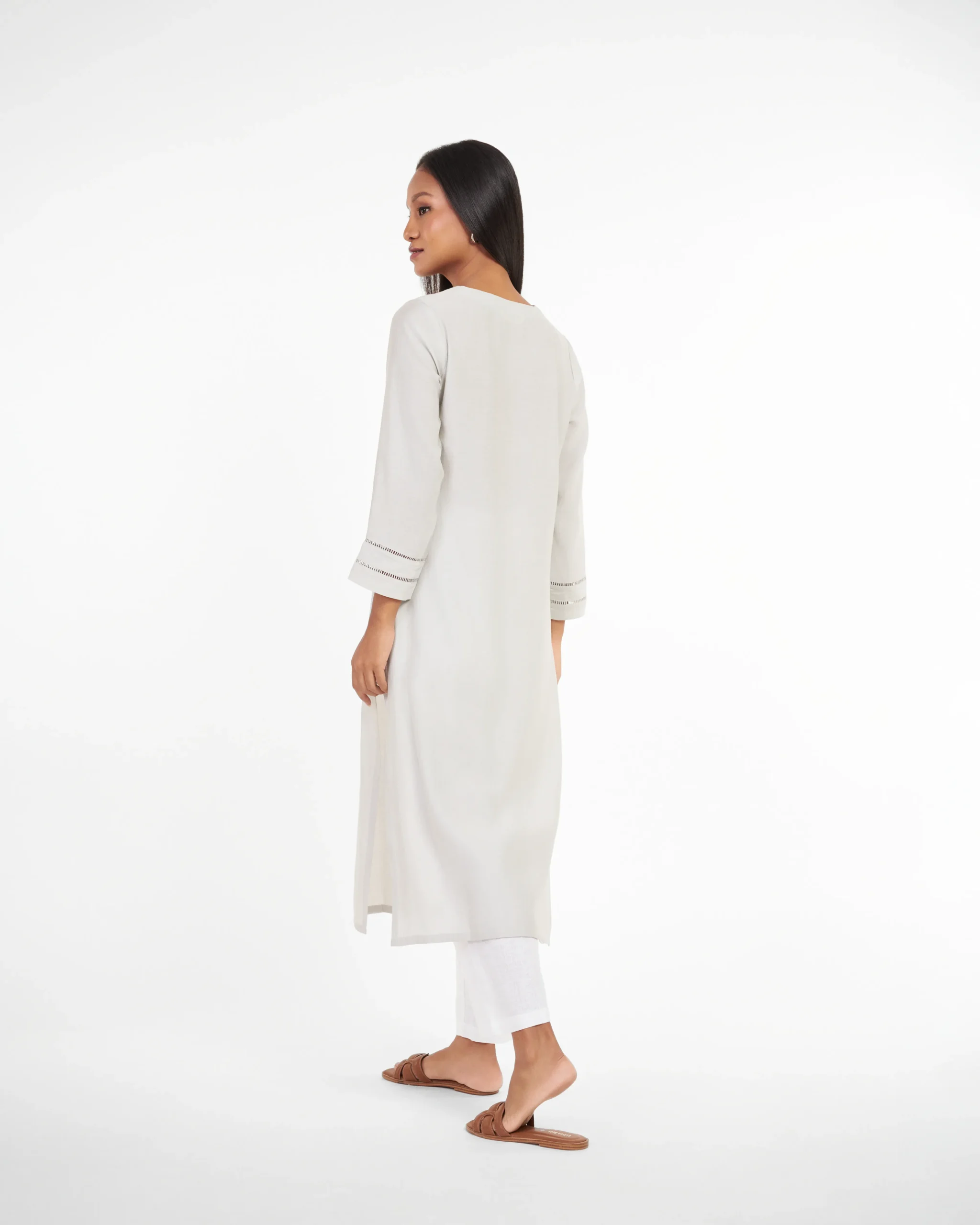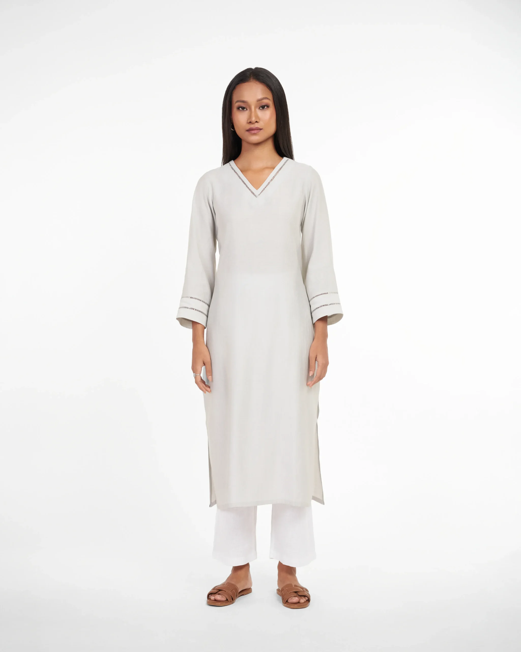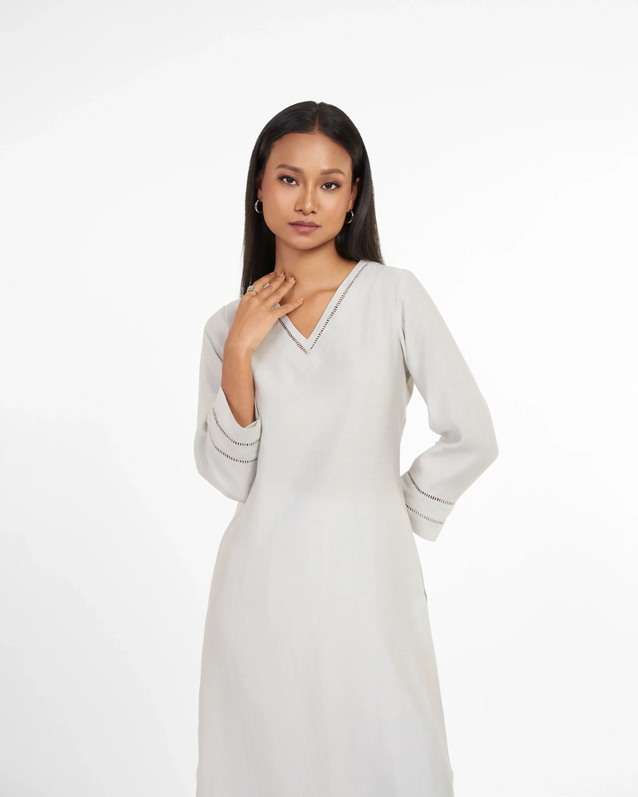 Experience the timeless allure of Smoky Ember, where rich grey hues meet sheen and sheer fabric. Delicate detailing on the neck and sleeves elevates chicness of the Kurti. Subtle sheen fabric and grey color palette exudes sophistication and versatility. Perfect for everyday office wear or business brunches and networking events.